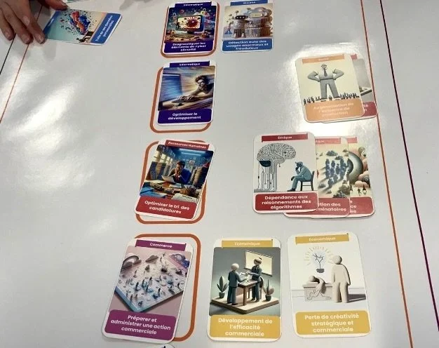 La personnalisation de chaque Fresque s’opère sur trois niveaux : le niveau de maturité des participants vis-à-vis de l’IA générative, leur métier et les spécificités de l’organisation (structure, culture, secteur d’activité, etc.).